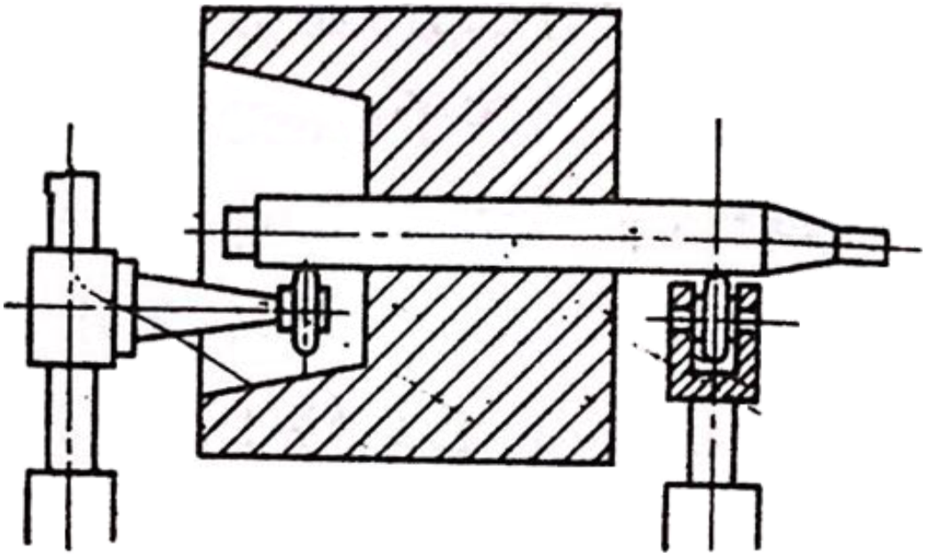 那么我們在考慮上述事項的基礎上,先要選擇適合各轉子的通用平衡機,那么對于標準型通用平衡機不適用的轉子來講,大部份的情況是,或者在通用型的平衡機上附件,或僅做局部改動使用通用平衡機。如圖所示的轉子,如果不加處理的話,就沒辦法裝在通用平衡機上,如果準備好特殊懸臂滾子支承,那么這樣的問題就能解決了,與此相同的例子為數不少。