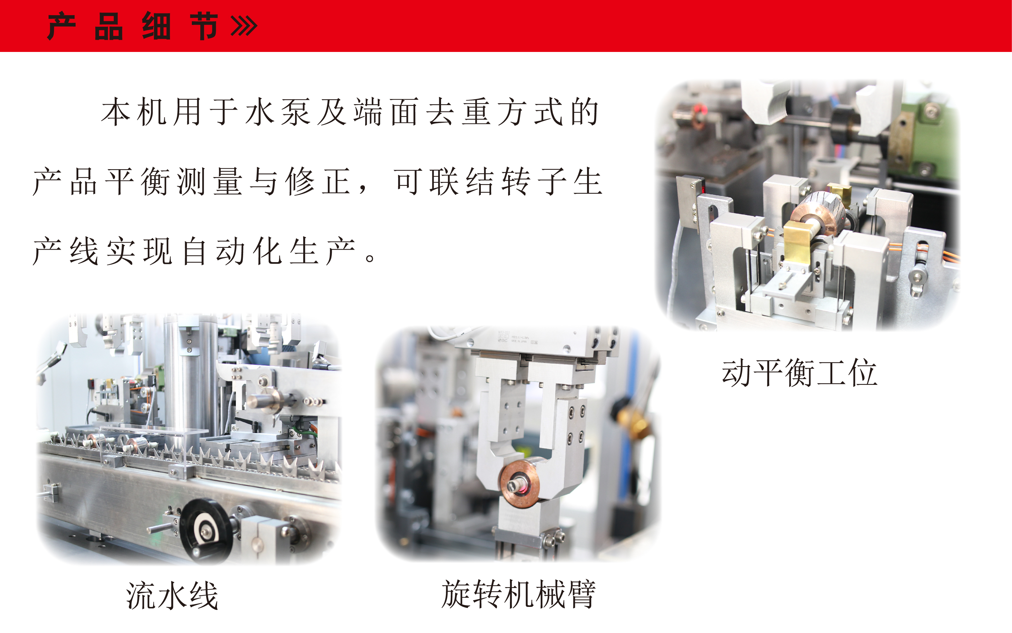 上海劍平此款轉子端面鉆孔四工位全自動平衡機,主要應用于水泵及端面去重方式的產品平衡測量與修正,可聯結轉子生產線實現自動化生產。
